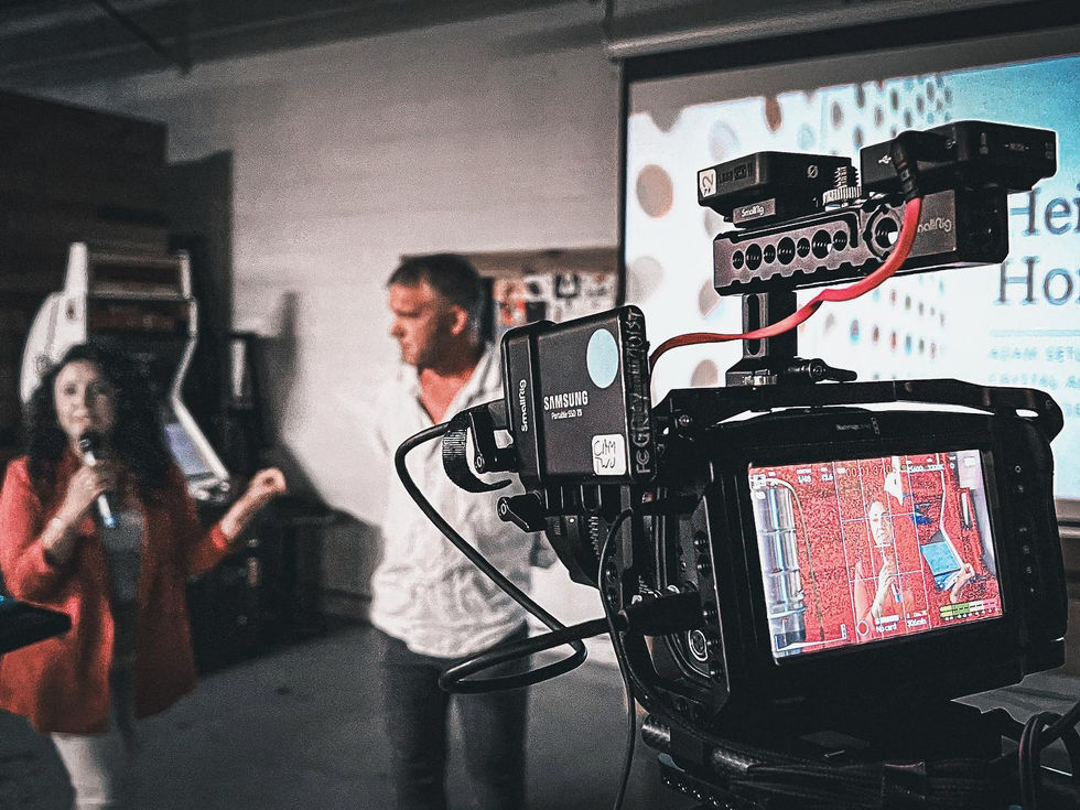Collection of images showcasing video production setup, filming, and crew working on promo videos.